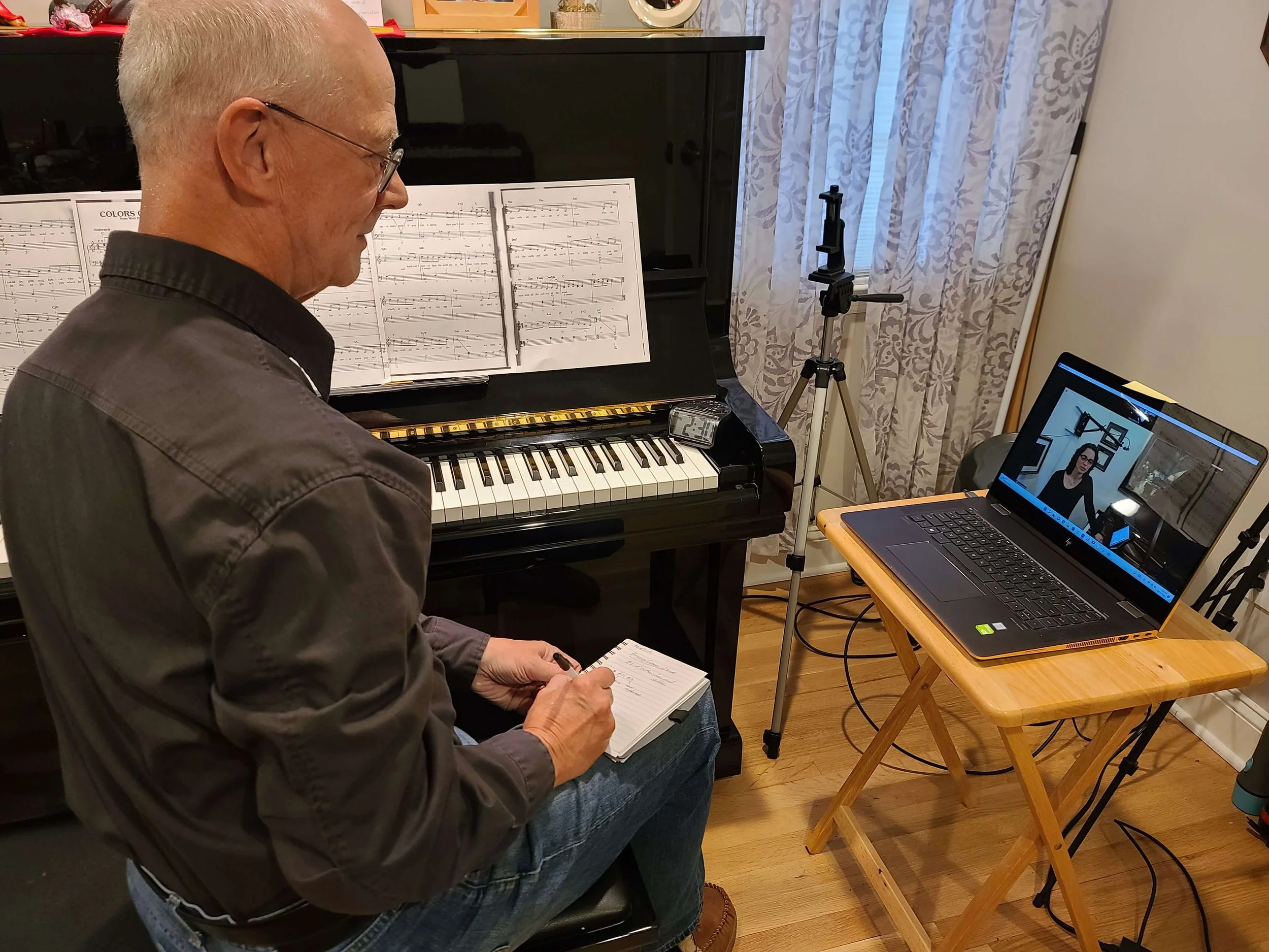 With Stephen’s help, I learned to use four cameras in my teaching setup: one for my face, one for my profile at the piano, an overhead for the keys, and one for the pedals. I also upgraded my audio interface to one that works better for online teaching (I never would have figured that out on my own).