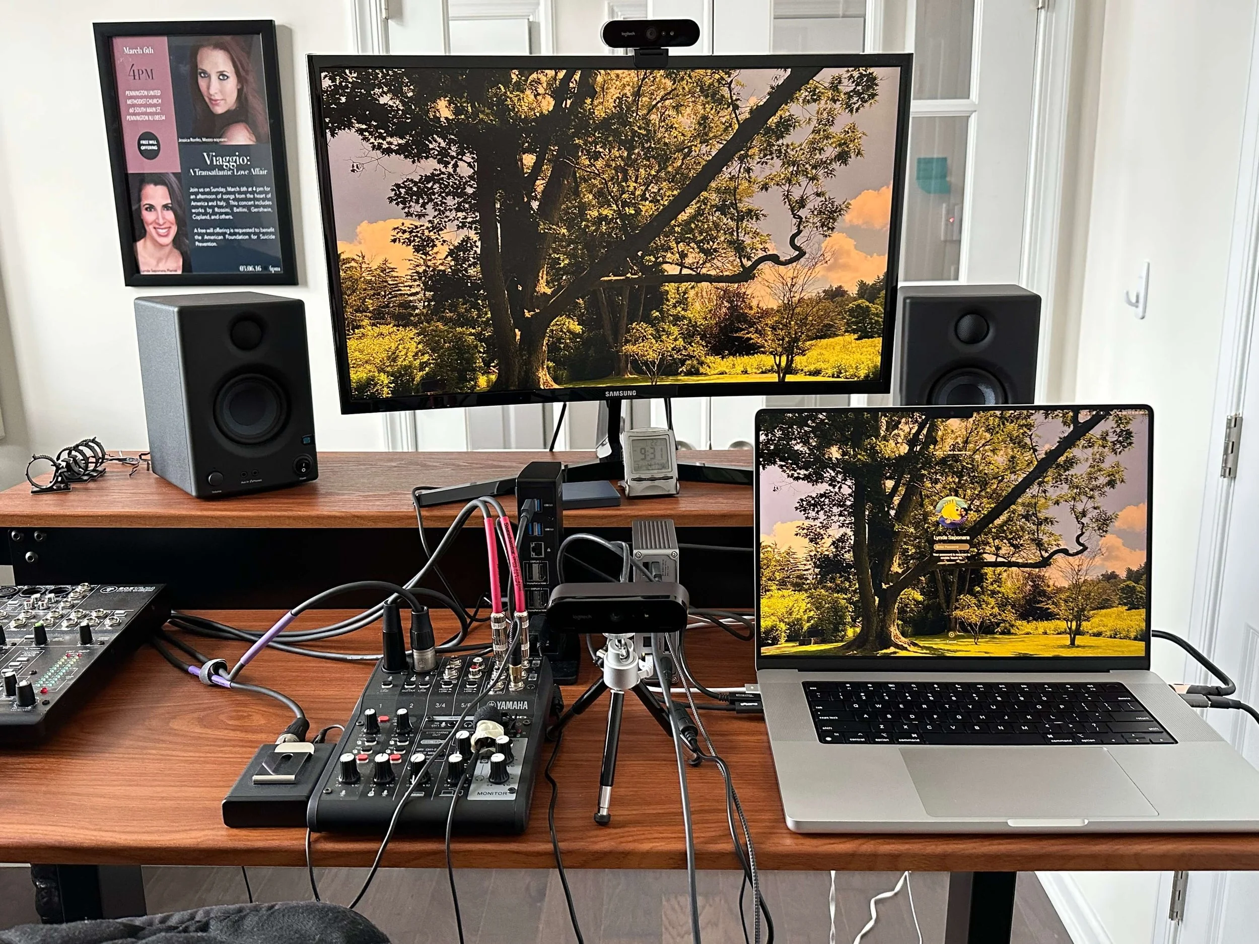 Following advice from some colleagues, I graduated from teaching on my phone to using a MacBook Air, an audio interface, and two mics. Those are pictured below in my “dining room setup”, which was a big improvement and worked well for a while.