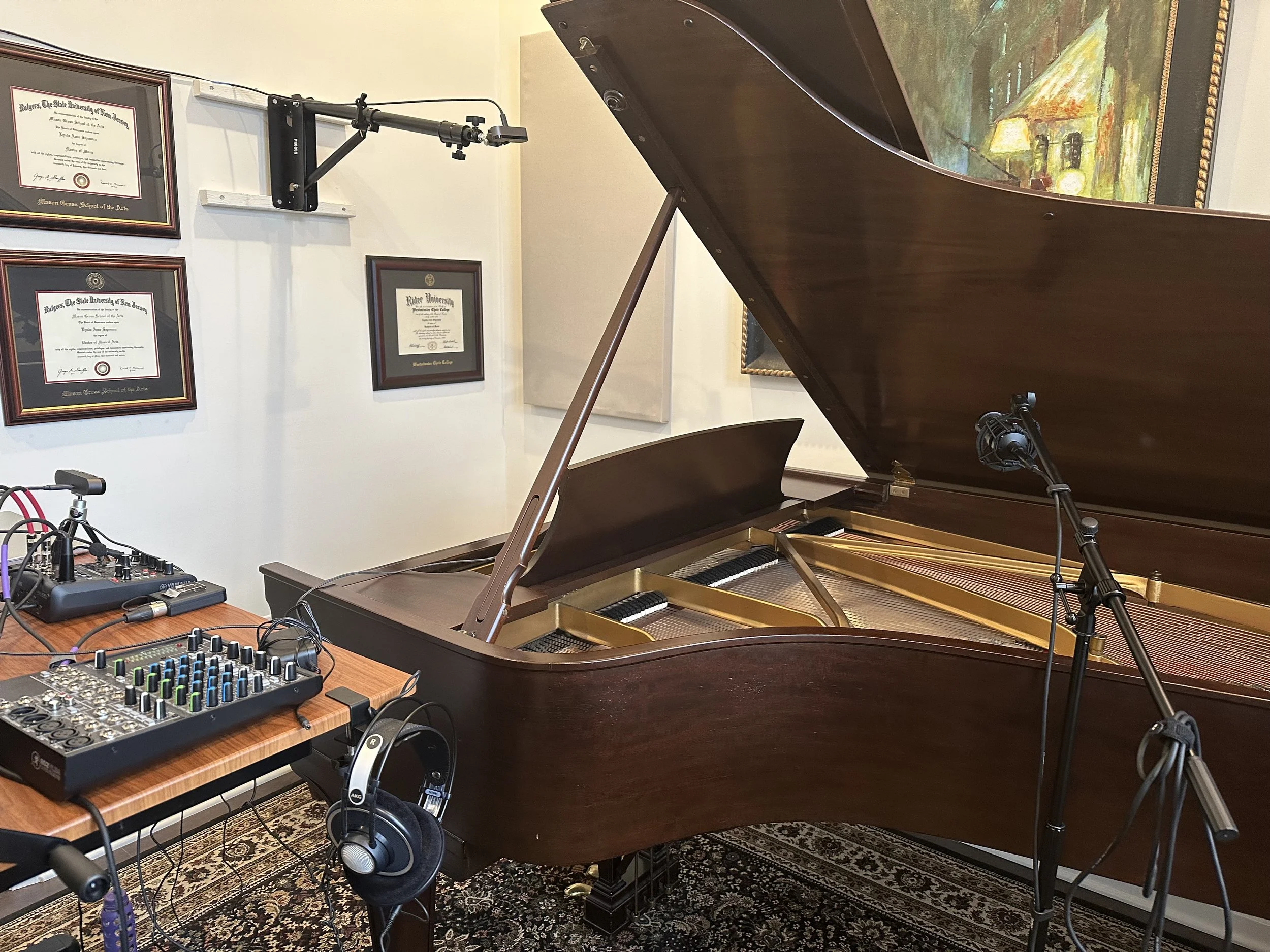 My 1933 Steinway B with microphone, and a view of the overhead and profile webcams.